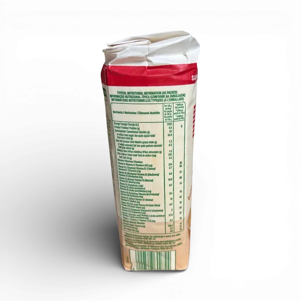 - Pre-cooked maize, Sugar, Flavouring, Minerals (Calcium carbonate, Electrolytic iron, Zinc oxide, Sodium selenite), Salt, Vitamins (A, B1, B2, B3, B5, B6, B7, B9, B12, C, E).