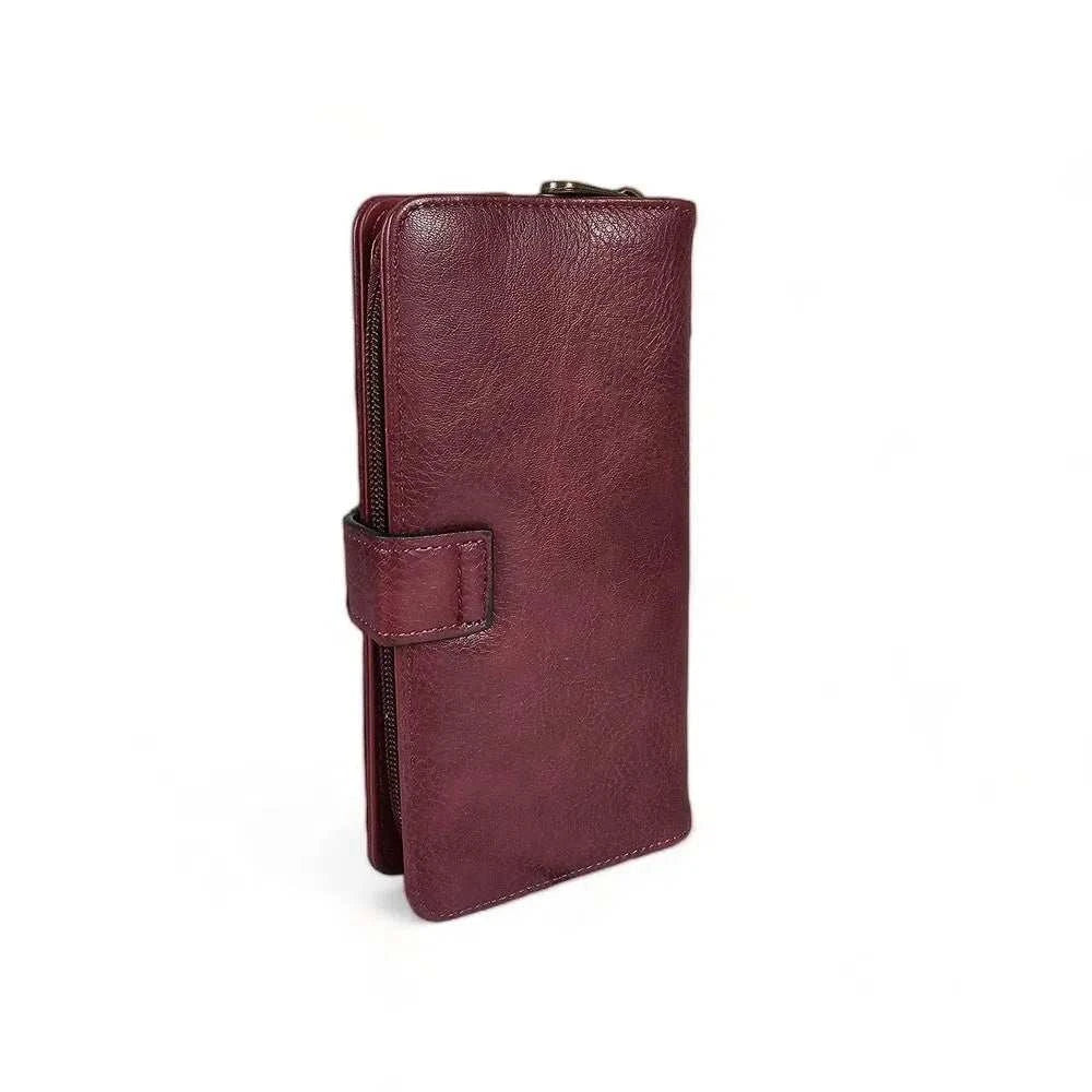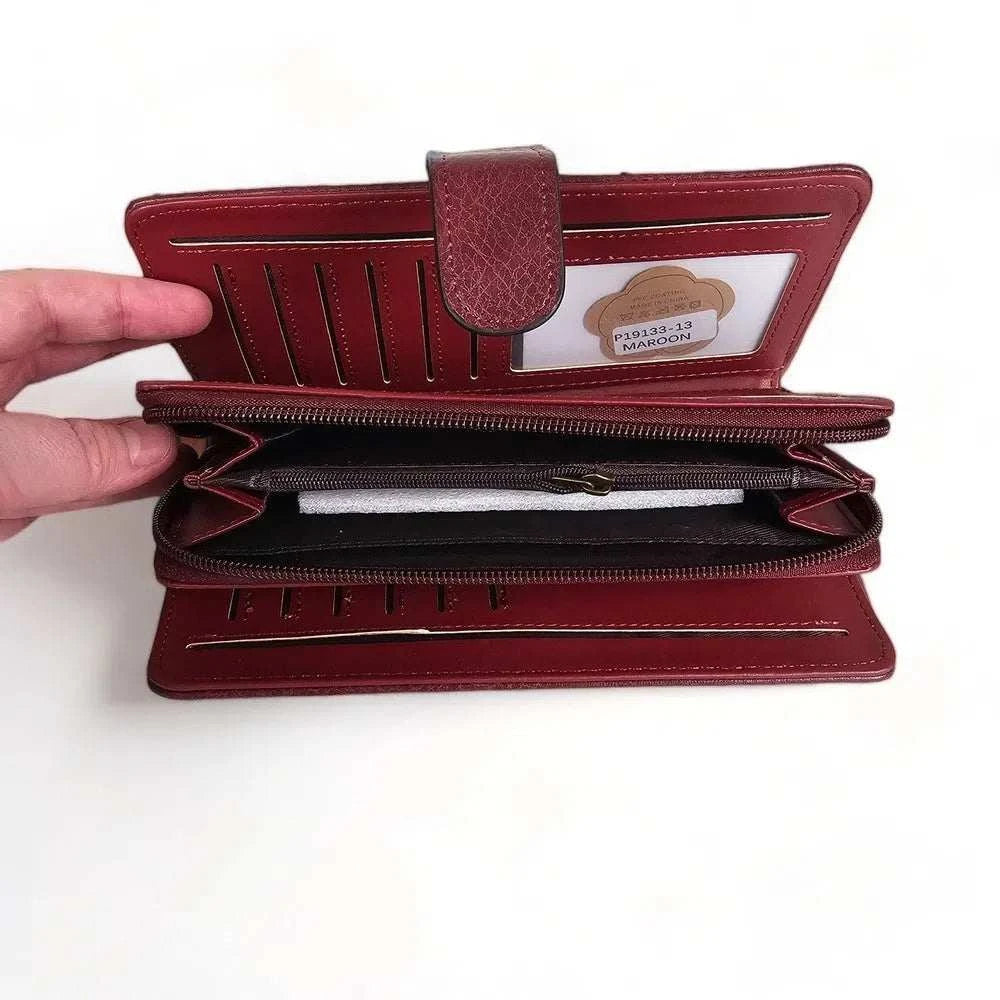 This maroon PU leather Large wallet boasts a Bronze-look metal windmill and logo. It features a spacious zip compartment in the center, with cardholders on either side and a clip closure for secure storage.