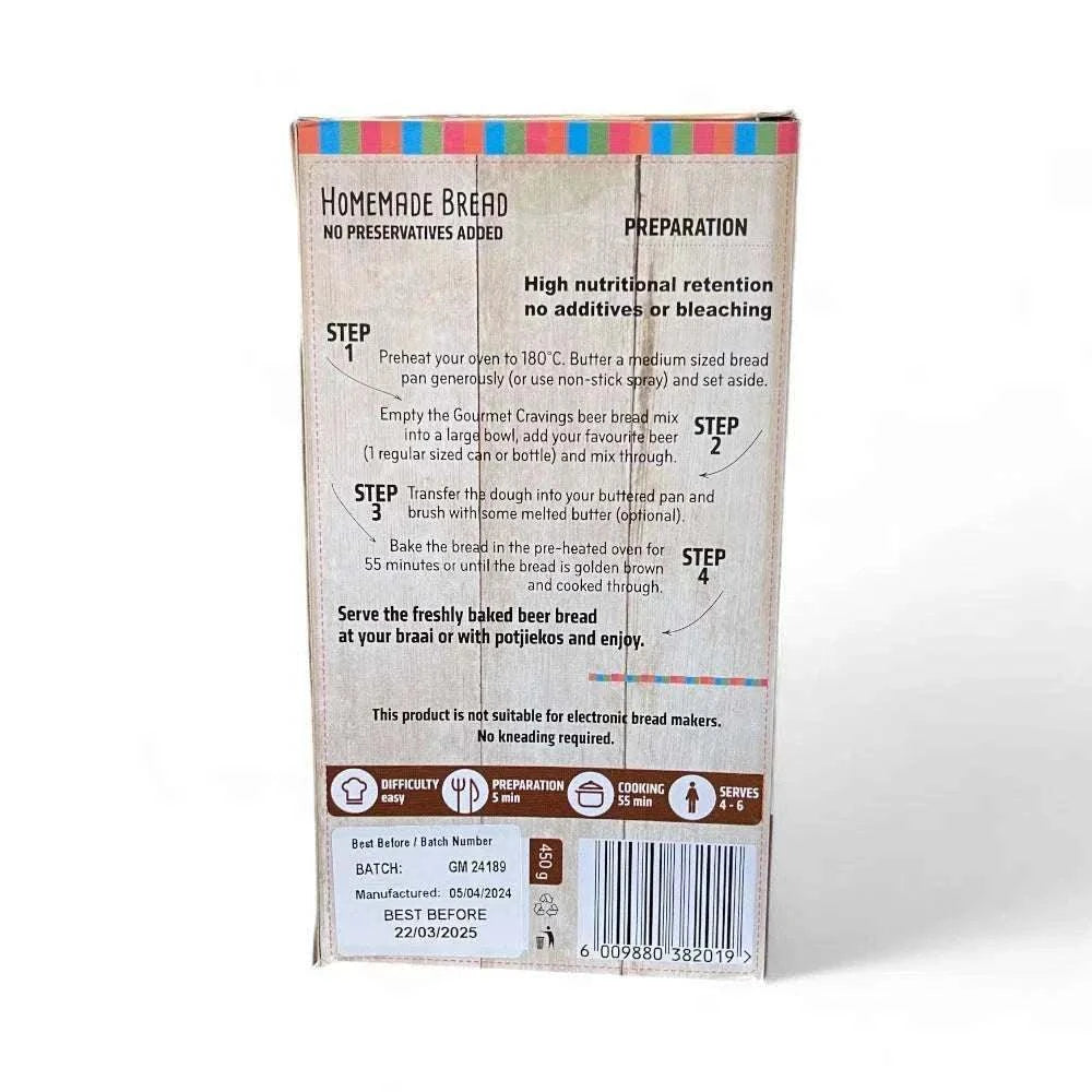 Bake your own delicious bread with a twist using the Gourmet Cravings Beer Bread Mix in Biltong Flavor. This easy-to-use mix is made from stone-ground, non-GMO flour and contains pure beef biltong for that authentic South African taste. Just add your favorite beer or cider, mix, and bake for a flavorful bread that pairs perfectly with any meal or braai.