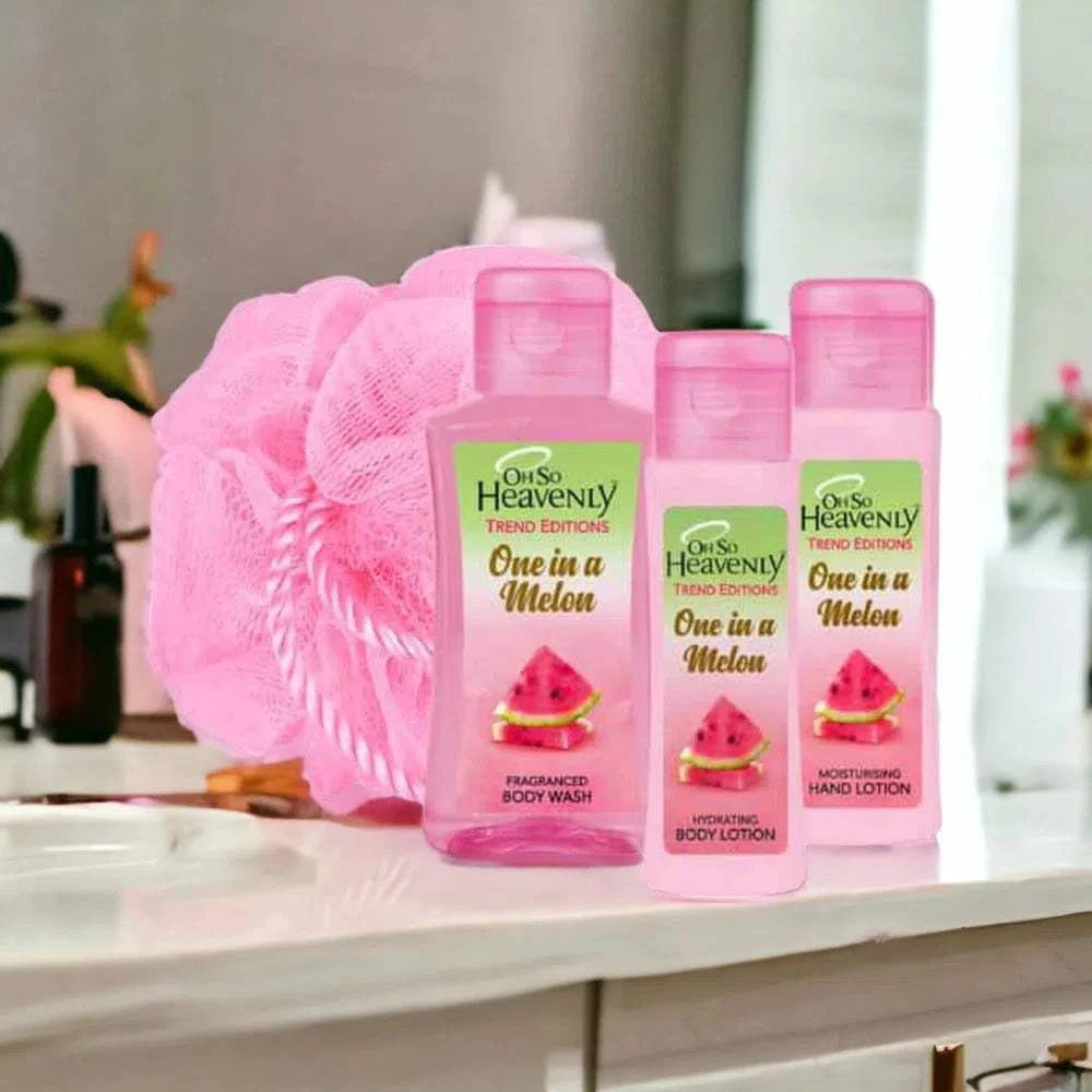 90ml One in a Melon Body Wash, 50ml One in a Melon Body Lotion, 50ml One in a Melon Hand Lotion, Loofah