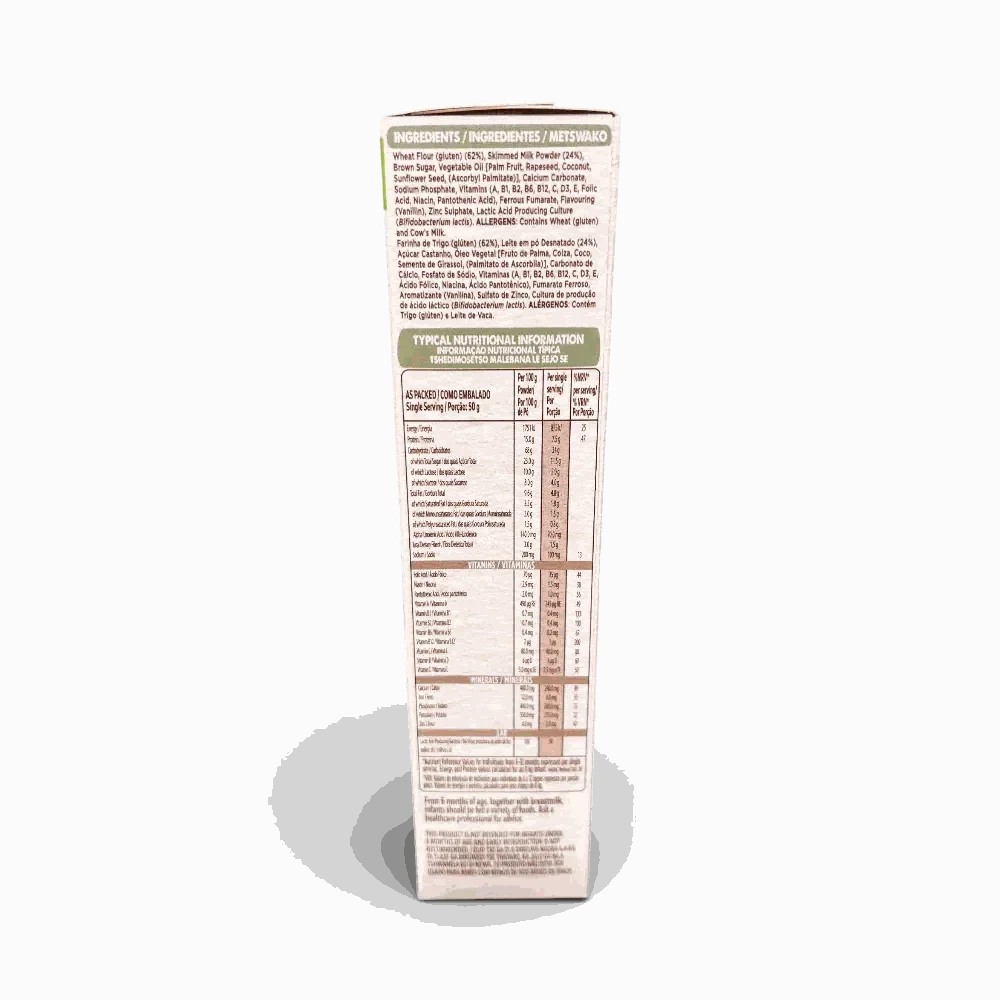Wheat Flour (Gluten), Skimmed Milk Powder (25%), Vegetable Oil (Palm Fruit, Rapeseed, Coconut, Sunflower Seed), Brown Sugar, Flavouring, Calcium Carbonate, Sodium Phosphate, Vitamins (A, B1, B2, B6, B12, C, D3, E, Folic Acid, Niacin, Pantothenic Acid), Ferrous Fumarate, Zinc Sulphate, LAB Culture (B. lactis).