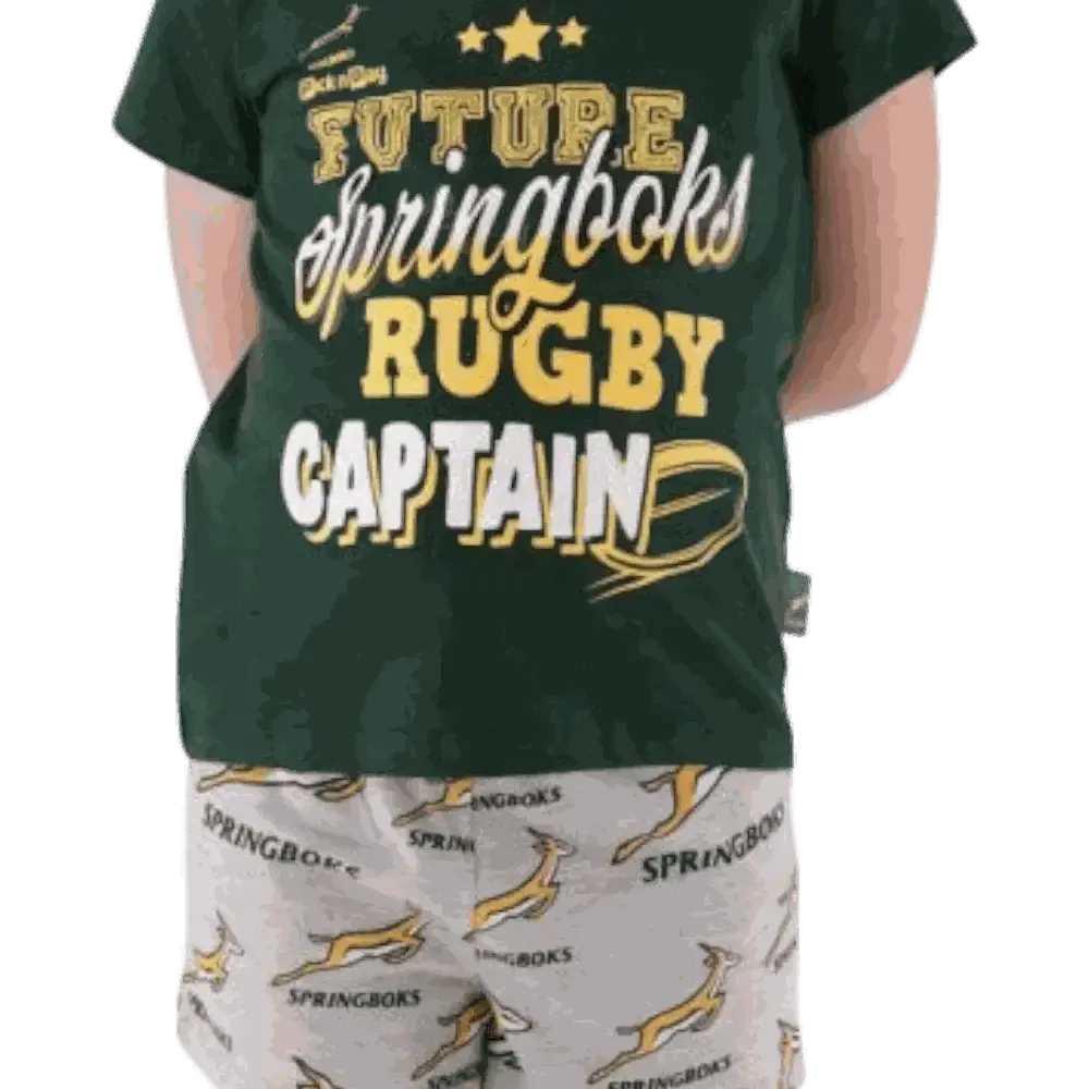 Made from 100% breathable cotton, the set includes a green short-sleeve top with a bold “Future Springboks Rugby Captain” print, and soft elastic-waist shorts covered in the official Springbok logo.