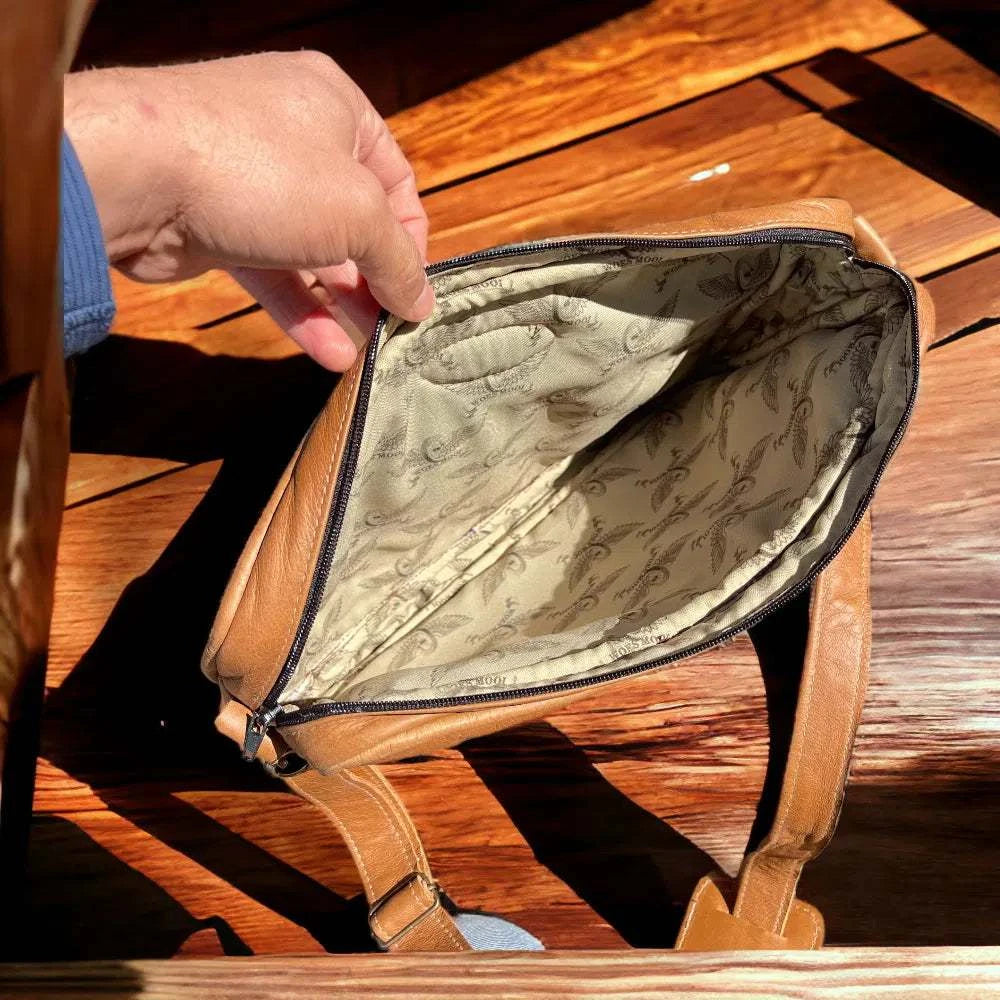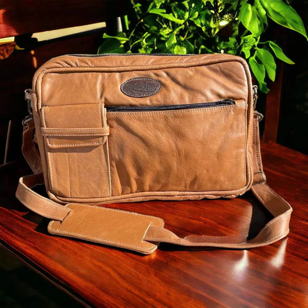 This genuine leather laptop bag from Woesmooi is perfect for both work and leisure. Crafted with carefully selected light-coloured leather, this bag is stylish and durable, providing ample space while making a statement. Its slim design and adjustable shoulder strap ensure comfortable transport of laptops up to 15.6”. Perfect for the modern professional.